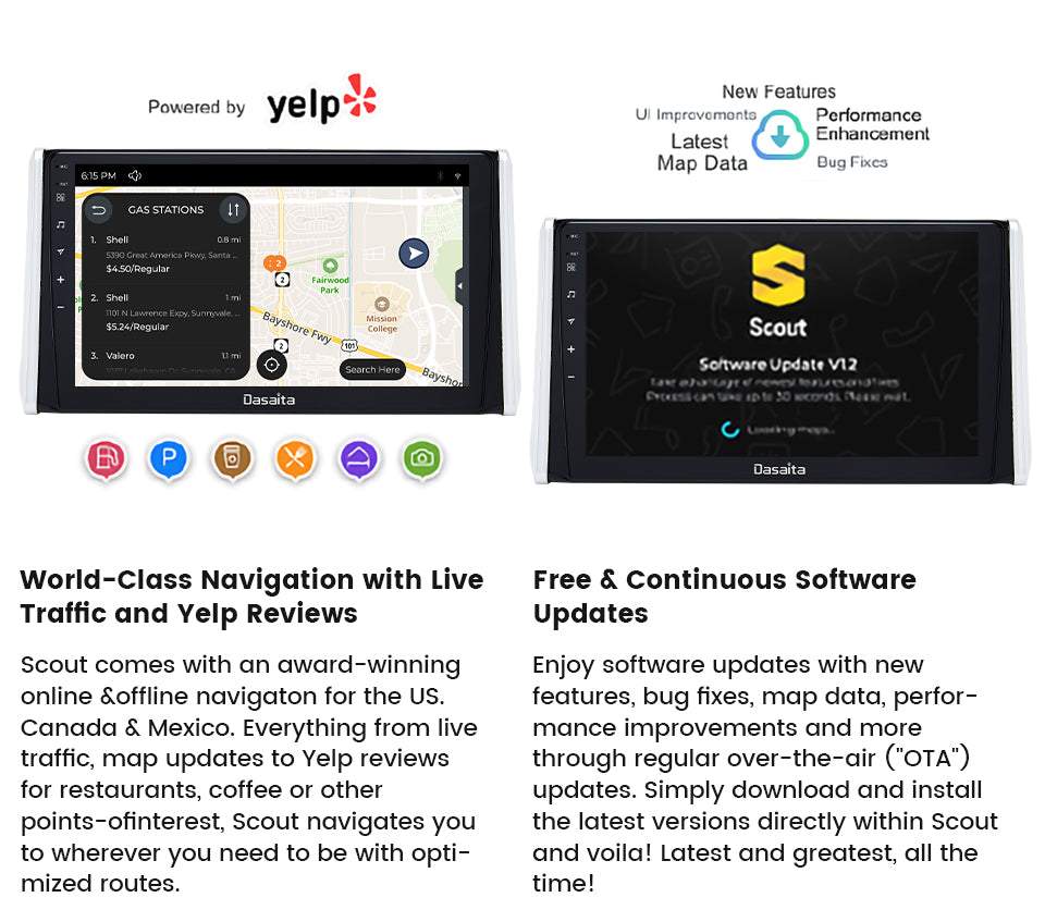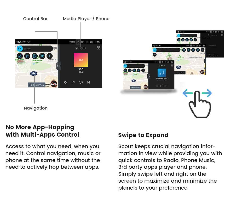 Scout offers Versatile In-Vehicle Infotainment Design and a truly safe driving experience that lets you access navigation, hands-free phone, music apps, BT Tethering, radio and more within the same view. -